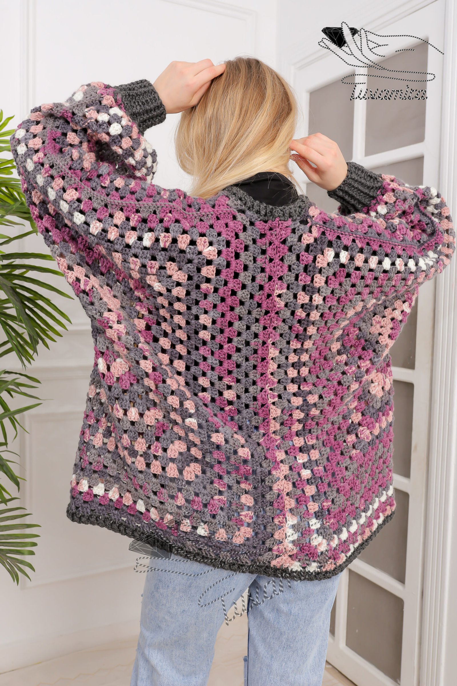 Dimension this winter crochet cardigan is 66 cm width × 70 cm length Oversize.